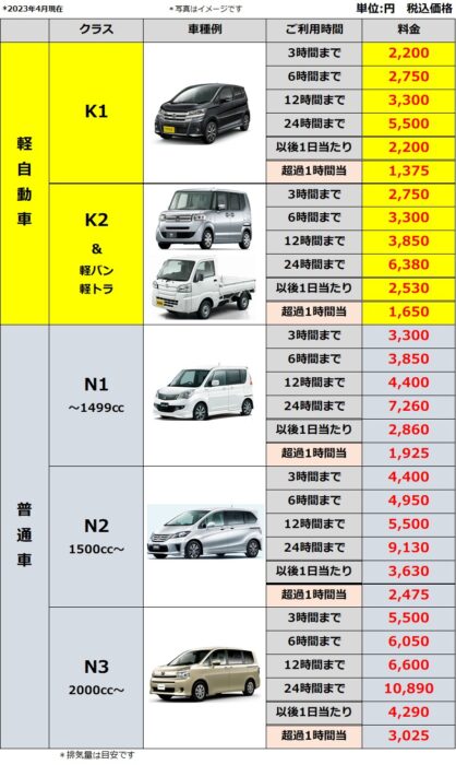 3時間2200円~全車カーナビ・ETC機標準装備、365日同一料金、距離制限無し
