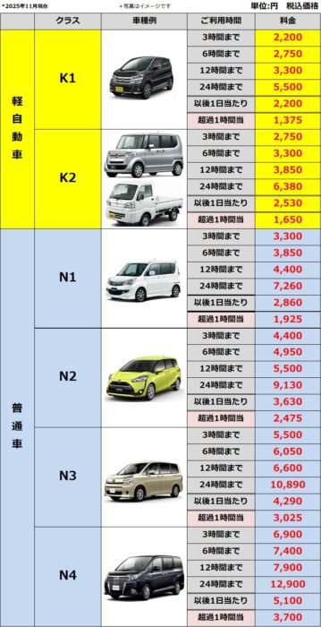 3時間2200円~全車カーナビ・ETC車載器標準装備、ハイシーズン料金なし、距離制限無し